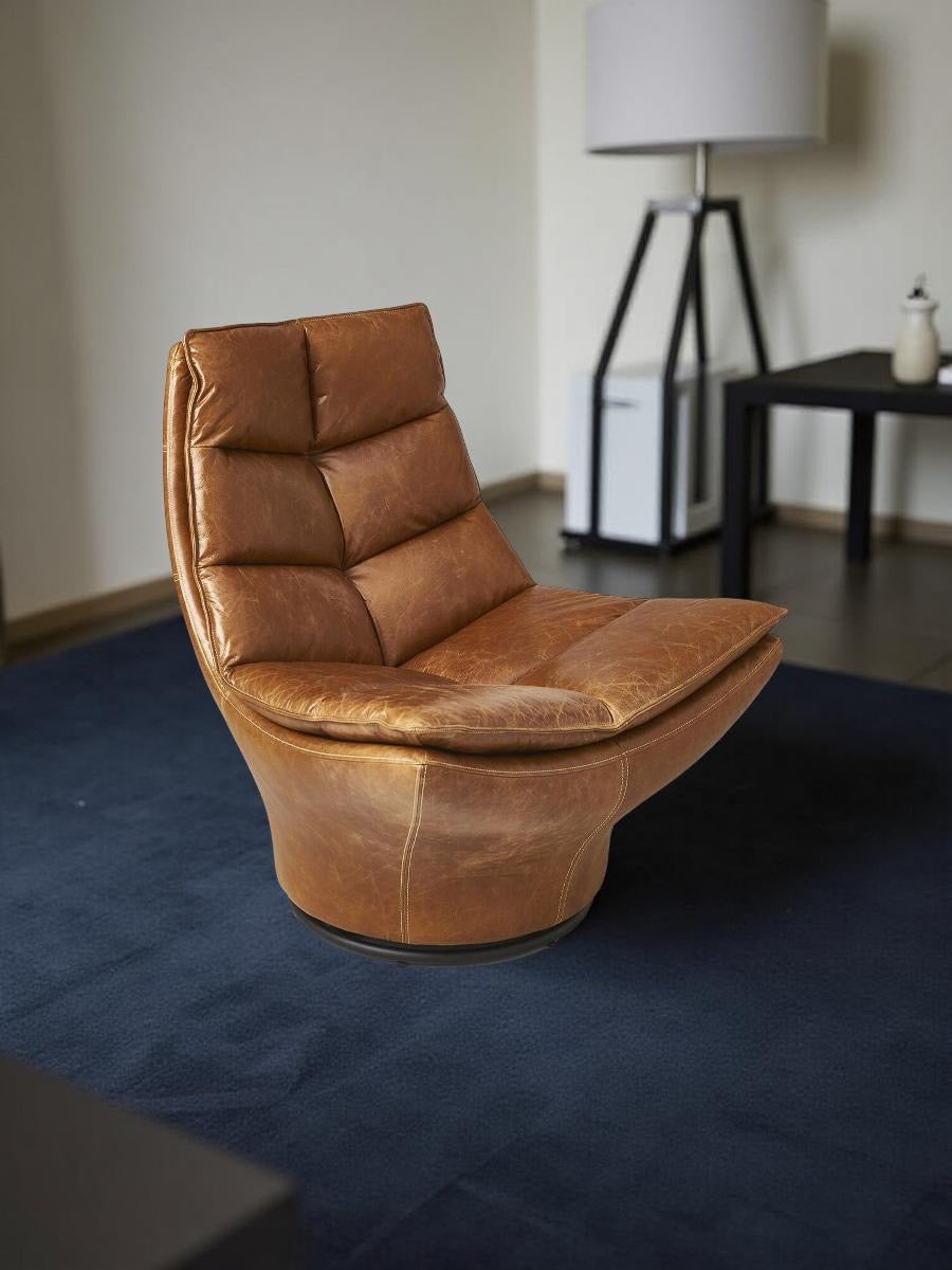 A sculptural, low-slung leather lounger that blends mid-century Italian charm with relaxed contemporary comfort. Wrapped in warm cognac leather, its naturally aged texture gives it a lived-in richness and effortless character. The chair curves in a seamless organic silhouette, widening at the base and gently tapering toward the top, creating a cocoon-like seat that envelopes the body. The triple-panel tufted backrest adds depth and a soft architectural rhythm, while the generous seat cushion provides a sink-in, lounge-all-day feel. Its swivel base makes it both functional and playful, perfect for a reading nook, a quiet corner, or a stylish statement in a modern inferior.