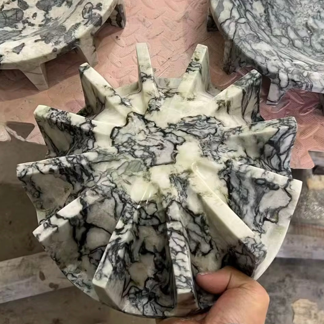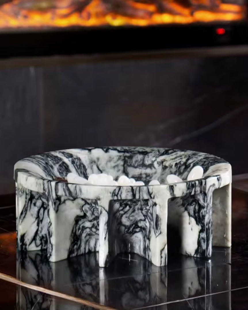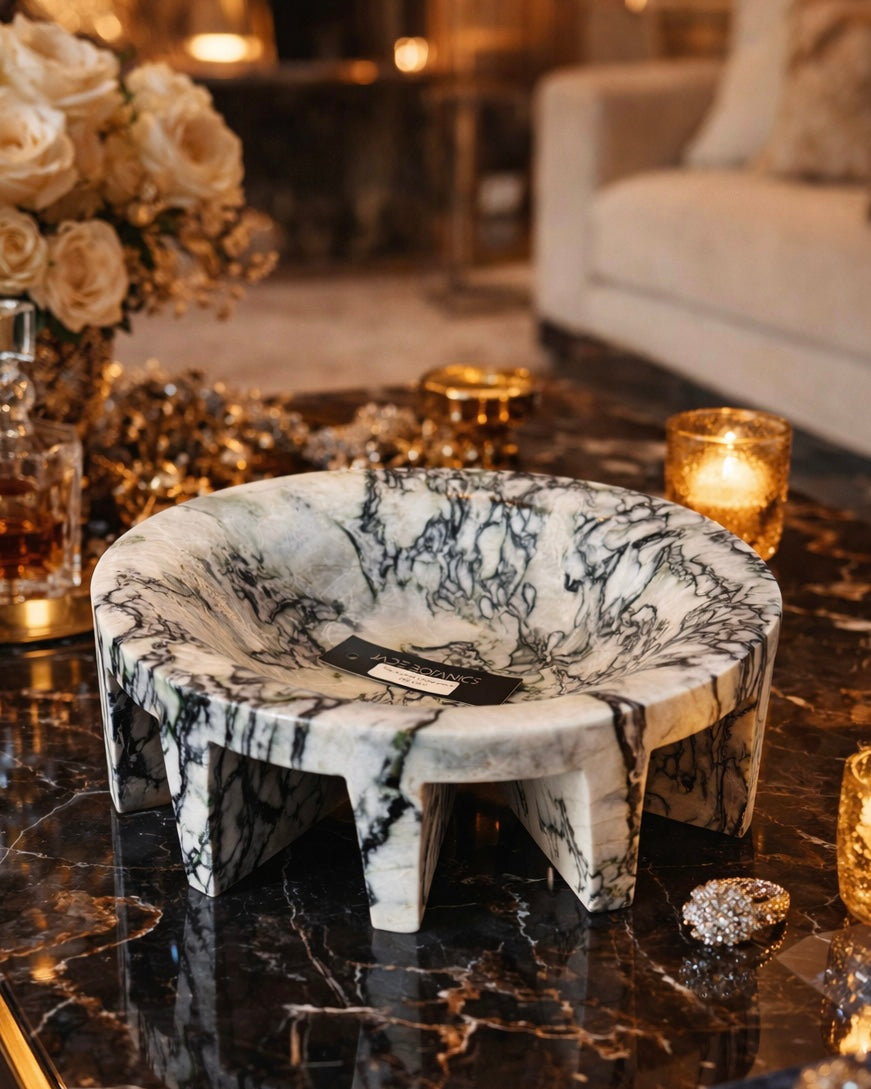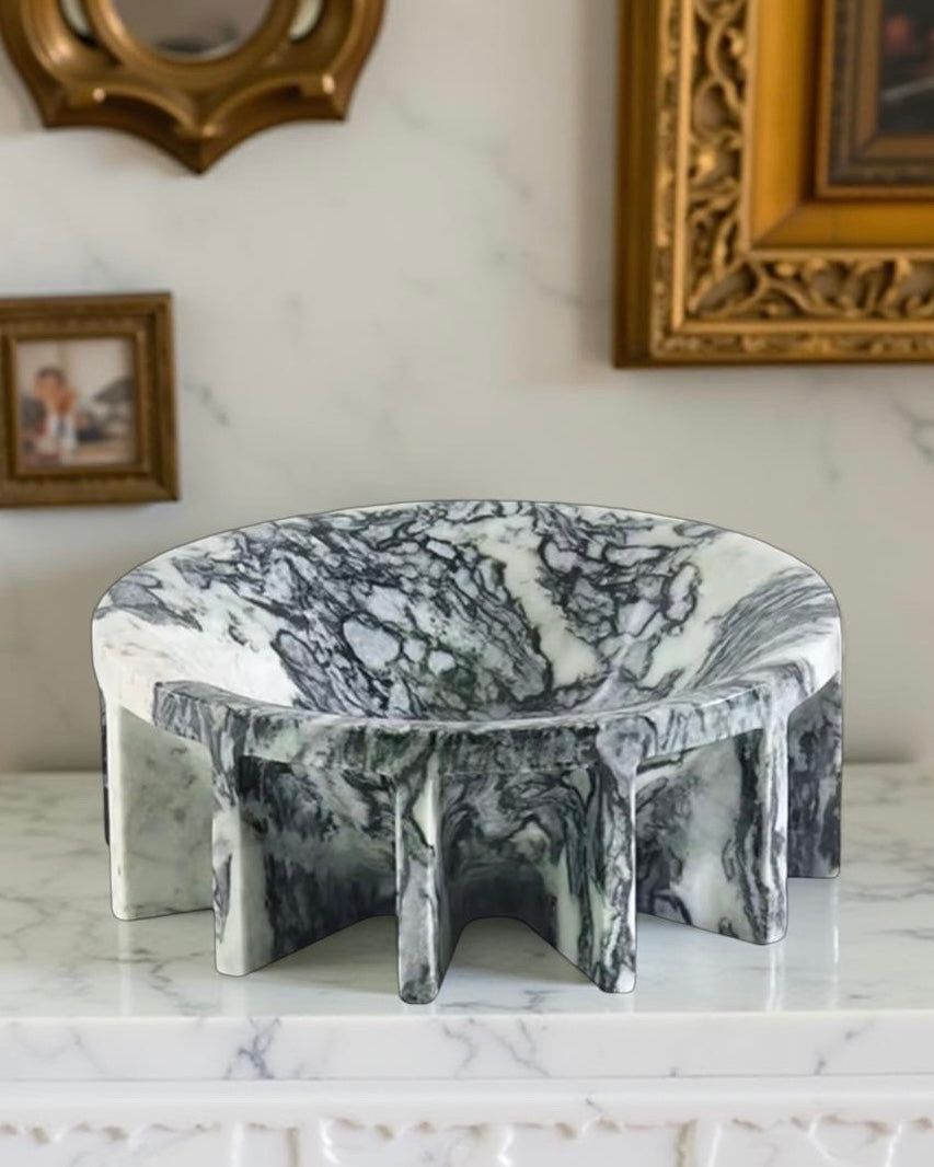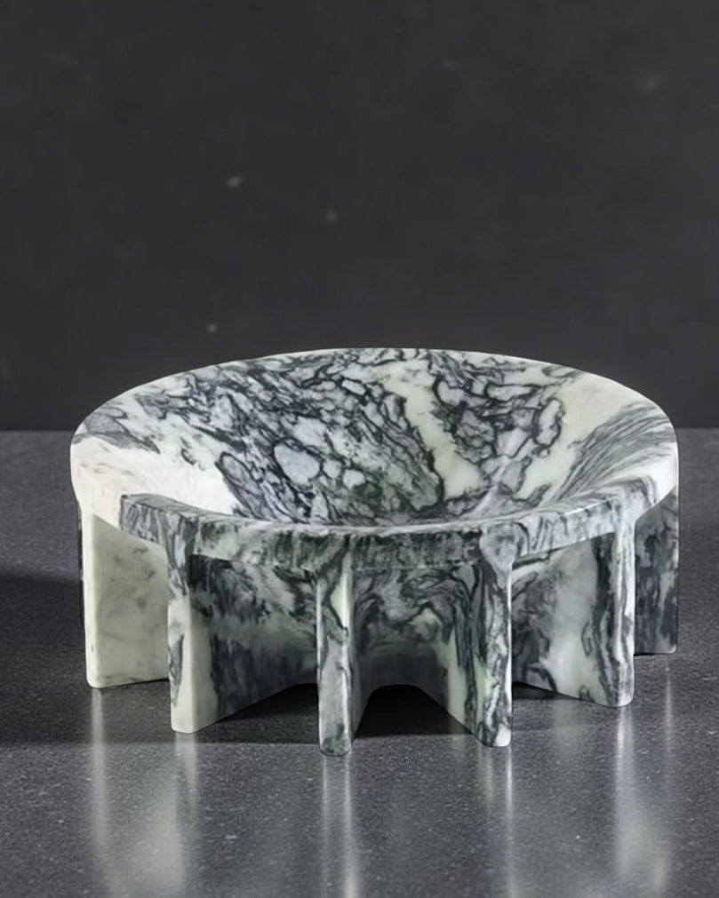Carved from richly veined stone, the Marble Reverie Bowl blurs the line between object and sculpture. Its deep, circular basin rests on softly arched legs, creating a sense of weight balanced with elegance. The dramatic grey-green marbling makes each piece feel one-of-a-kind, while the elevated form invites light and shadow to play beneath it. Designed for JADE BOTANICS to stand alone as a statement, it brings a timeless, gallery-worthy presence to any surface.