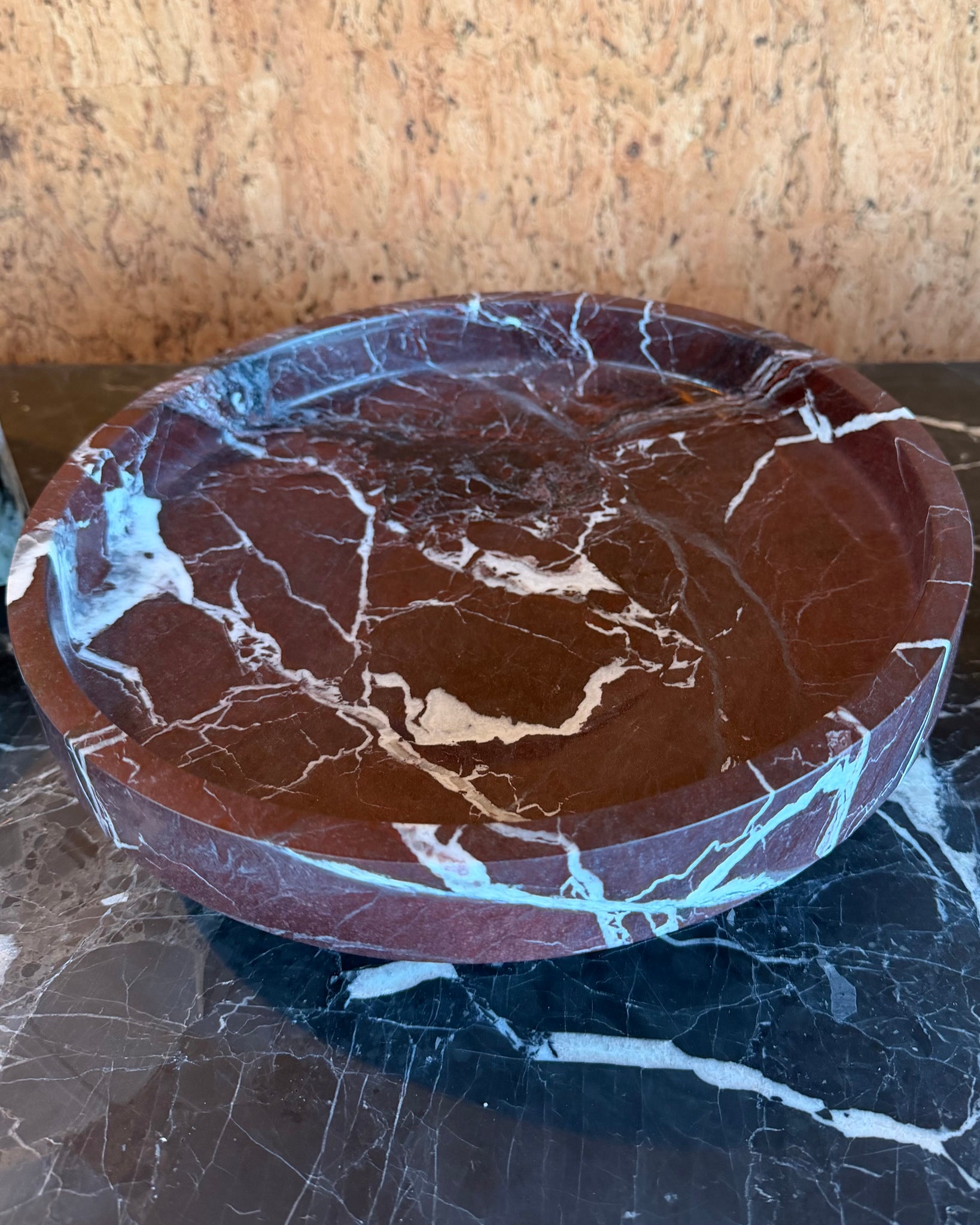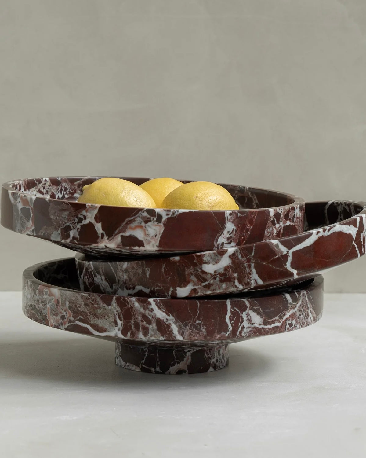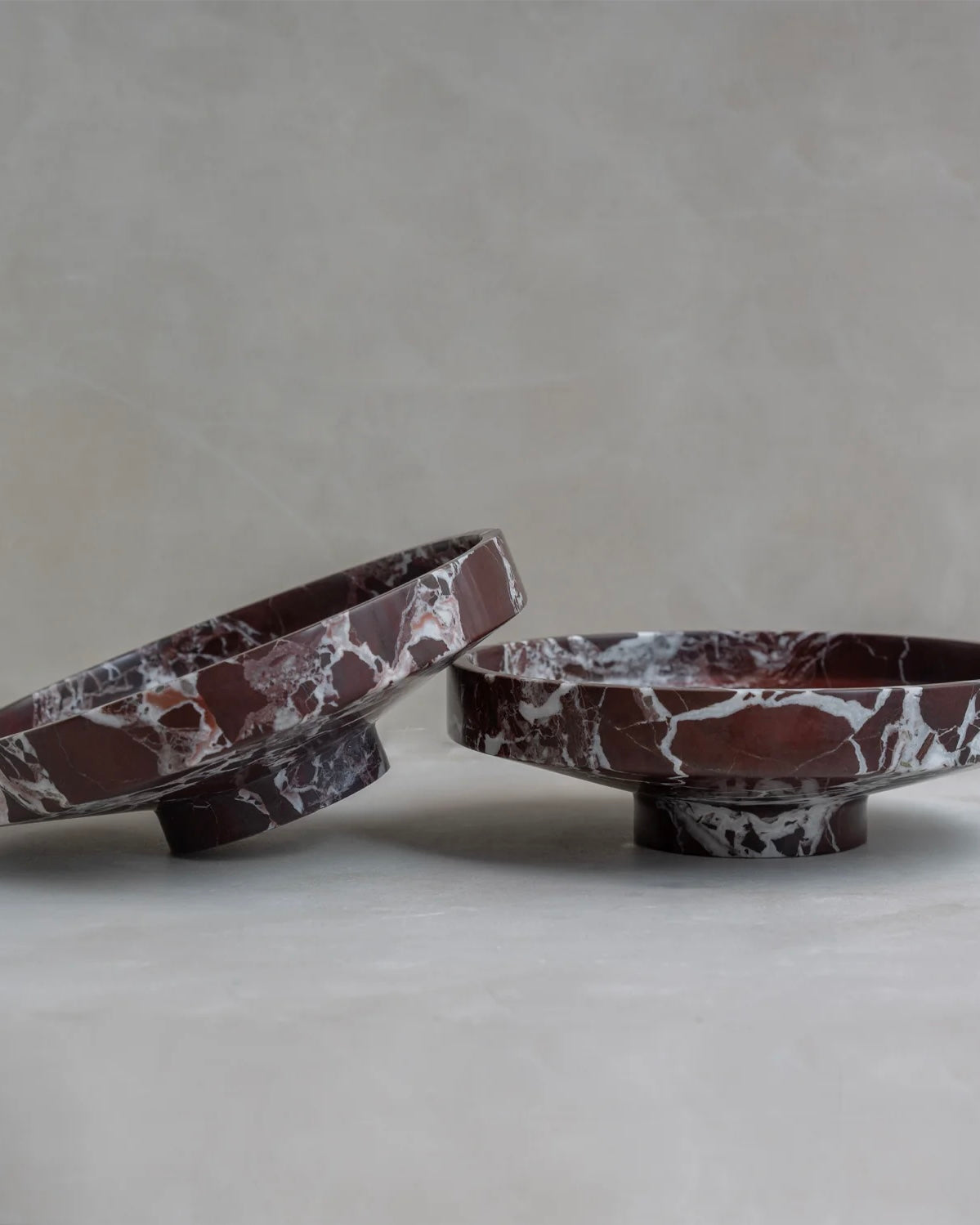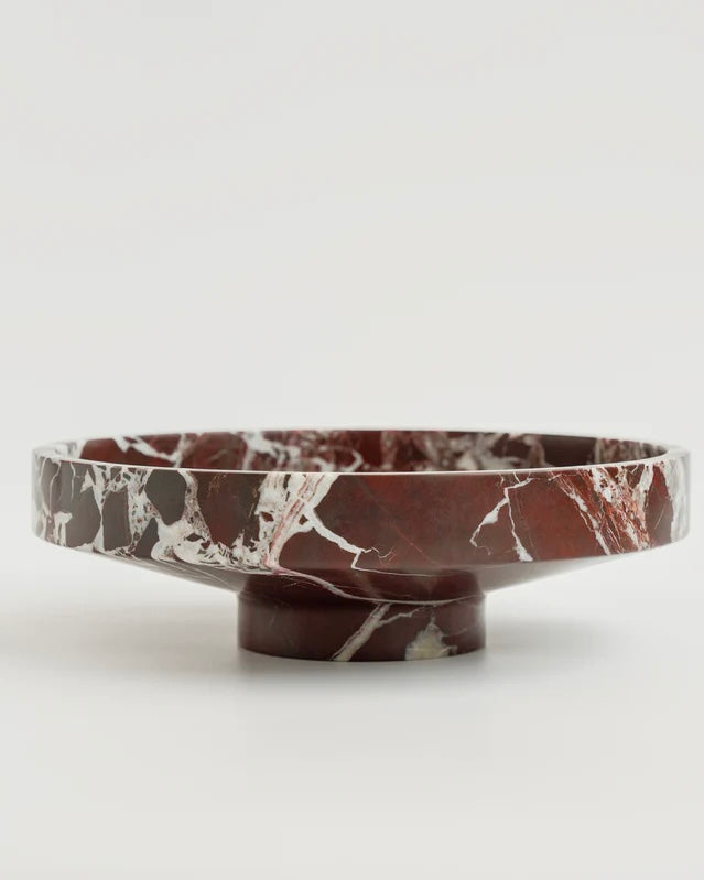 A low-profile pedestal vessel carved from solid marble, distinguished by its broad, shallow basin and monolithic foot. The piece showcases naturally occurring red stone with pronounced white veining, finished to a high polish that accentuates the material’s depth and variation. Its restrained geometry and emphasis on mass and surface position it as both a functional object and a sculptural design element, produced as an exclusive Jade Botanics Home edition, underscoring its limited availability and collectible design value.