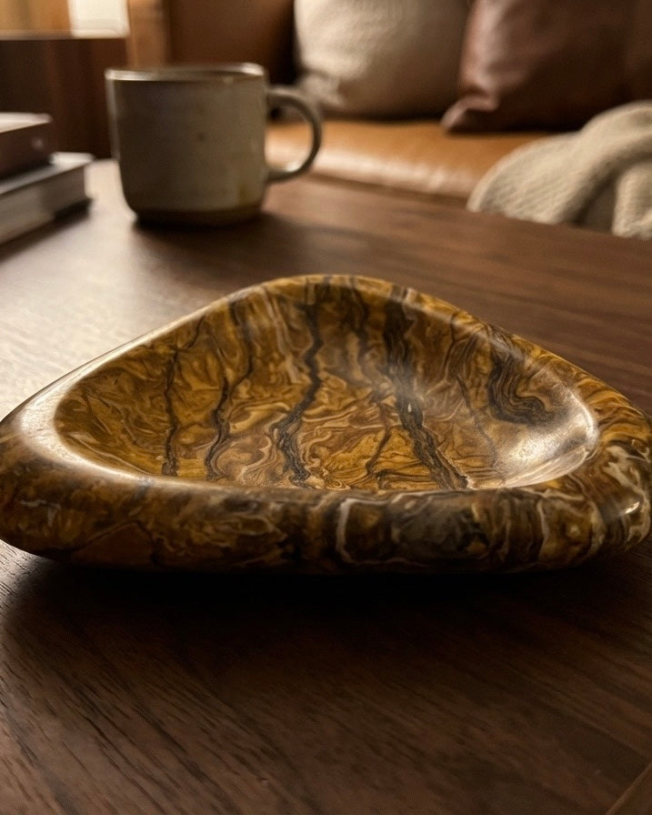 The JADE BOTANICS Sahara Ashtray is carved from Rainforest Brown Marble, a natural stone admired for its rich earth tones and flowing veining that echo organic landscapes. Each piece is unique, shaped by nature and refined by hand.