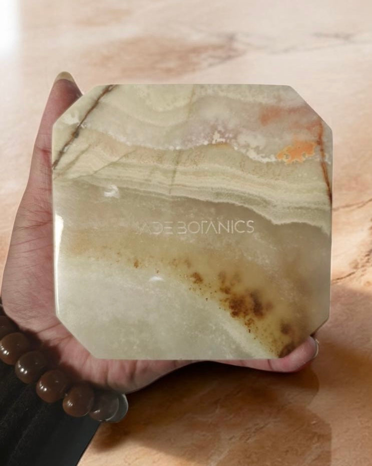 The VELVET SMOKE Onyx Ashtray from the JADE BOTANICS Home Collection 2026 is a sculptural statement piece crafted from Italian jade onyx marble. Showcasing soft translucent green hues with natural veining in cream, beige, and warm amber, each piece is uniquely patterned by nature.